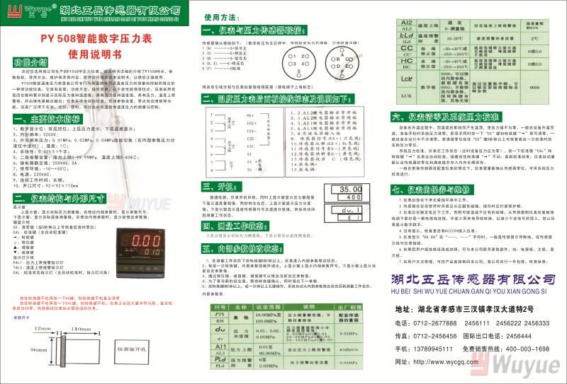 歡迎您選用湖北五岳傳感器有限公司生產(chǎn)的PY508/PY1508智能數(shù)字壓力儀表。該說(shuō)明書(shū)詳細(xì)的介紹了PY508/PY1508的性能特點(diǎn),參數(shù)指標(biāo),使用方法,維護(hù)保養(yǎng)等內(nèi)容。使用前仔細(xì)閱讀本說(shuō)明書(shū),以便您正確使用。