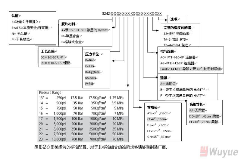 輸出,模擬:4-20mA(標(biāo)準(zhǔn)壓力,溫度可選) 輸出,數(shù)字:HART 綜合精度(錯(cuò)誤)(20-100%滿(mǎn)量程): ±0.25%滿(mǎn)量程(3M和3M以上) ±0.35%滿(mǎn)量程(1.5M和1.5以下) 溫度漂移(77-572℉,25-300℃): 0.001%滿(mǎn)量程/℉,最大(0.001%滿(mǎn)量程/℃,最大) 重復(fù)性:±0.1%滿(mǎn)量程 爆破額定壓力:2X滿(mǎn)量程 超壓 額定:1.5X滿(mǎn)量程 量程:1,500至10,000psi 可調(diào)范圍:6:1調(diào)節(jié)比,向下 負(fù)載電阻:250歐姆@18Vdc;500歐姆@23Vdc |