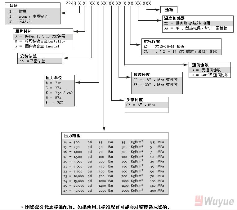 溫度和機械特性 最高膜片溫度:750°F(400℃) 零點漂移(隨溫度改變): 15 psi / 100°F典型值(27 psi / 100℃ ) 電子元件工作溫度:-20°-185°F(-29°-85℃) 超過補償溫度范圍的影響『0°至150°F(-18°-65°C )-零點和量程』: 0.01%滿量程/°F最大(0.02%滿量程/℃ 最大) 安裝螺栓扭矩: 40 inch / lbs. 最大 標準潤濕元件:DyMaxTM15-5 PH SST 涂層 |
